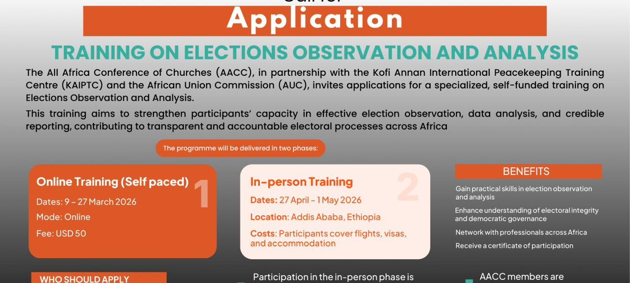 The All Africa Conference of Churches (AACC), in partnership with the Kofi Annan International Peacekeeping Training Centre (KAIPTC) and the African Union Commission (AUC) is pleased to invite applications for a specialized training on Elections Observation and Analysis.